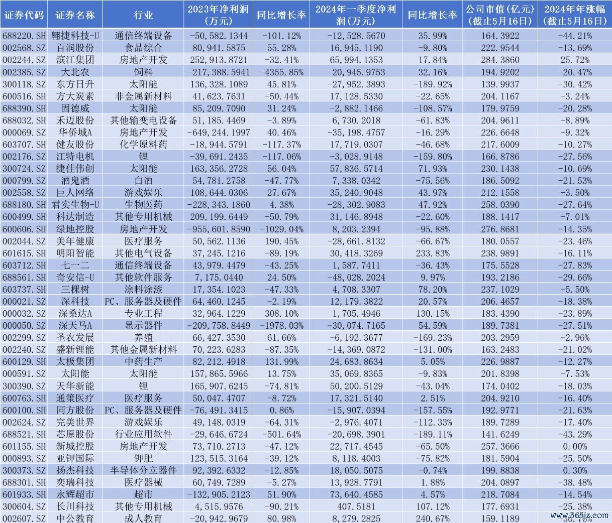 业绩表现上,这41家上市公司中,2023年财报有16家实现了正增长,25家公司处于业绩处于下滑状态,其中深桑达A以308.10%位居首位,有3家公司2023年业绩跌幅达到1000%,大北农以4355.85%的跌幅,位居末位。