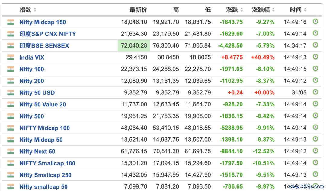 英为财情数据显示,印度主要股指均大幅下跌,与此同时,印度VIX恐慌指数跳涨,截至发稿涨超40%。