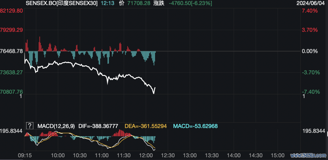 当地时间6月4日,印度股市开盘后持续走低。截至发稿,印度SENSEX30指数跌超6%,盘中一度跌超7%。