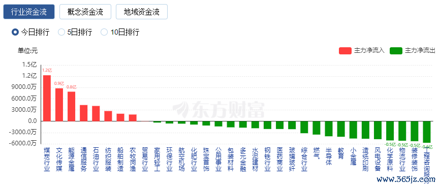 行业资金方面,截至午间收盘,煤炭行业、文化传媒等净流入排名靠前,其中煤炭行业净流入1.2亿元。