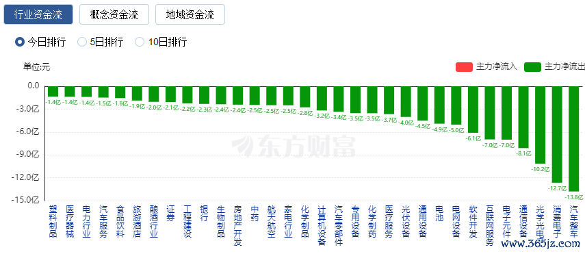 净流出方面,汽车整车、消费电子等排名靠前,其中汽车整车净流出13.8亿元。