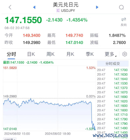 非美货币纷纷大涨!美元兑日元短线跌幅扩大至近200点,日内跌幅近1.50%,现报147.155。