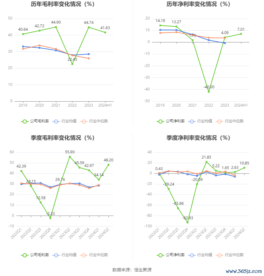 2024年上半年,公司毛利率为41.63%,同比下降3.93个百分点;净利率为7.01%,较上年同期上升1.74个百分点。从单季度指标来看,2024年第二季度公司毛利率为48.20%,同比下降7.70个百分点,环比上升14.06个百分点;净利率为10.85%,较上年同期下降11.00个百分点,较上一季度上升8.22个百分点。