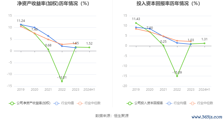 数据显示,2024年上半年公司加权平均净资产收益率为1.52%,较上年同期增长0.64个百分点;公司2024年上半年投入资本回报率为1.31%,较上年同期增长0.90个百分点。