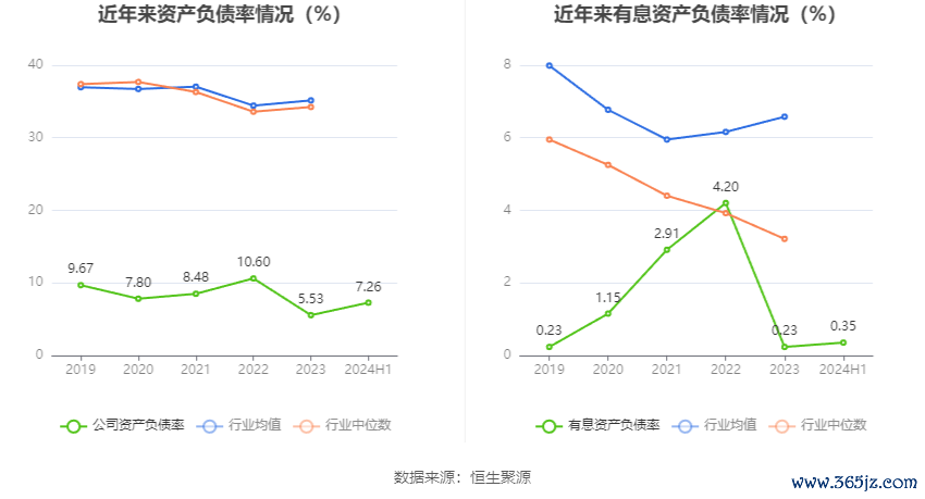 在偿债能力方面,公司2024年上半年末资产负债率为7.26%,相比上年末上升1.73个百分点;有息资产负债率为0.35%,相比上年末上升0.12个百分点。