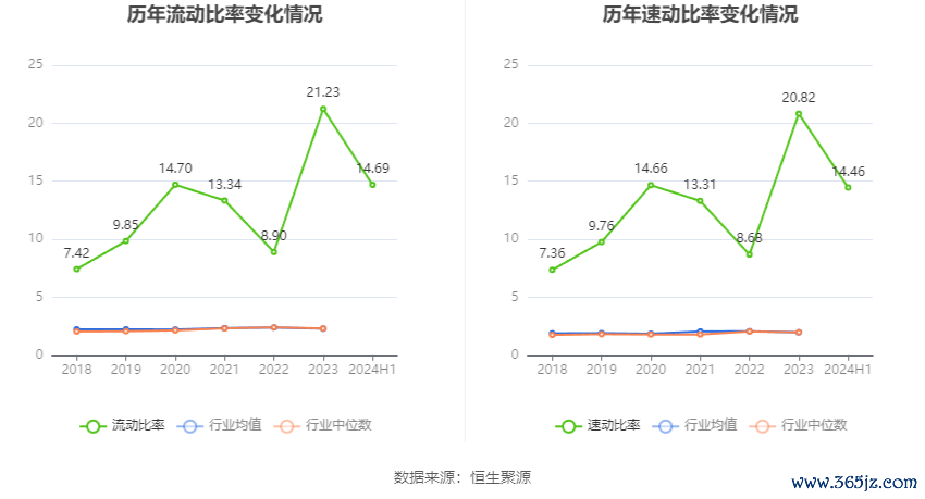 2024年上半年,公司流动比率为14.69,速动比率为14.46。